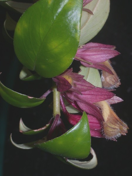 - v páru nestejné, řapíkaté, vejčitě elipčité, do 0.1 m dlouhé, masité, olysávající (vespod však s pýřitou nervaturou)